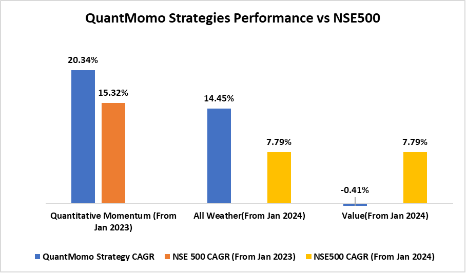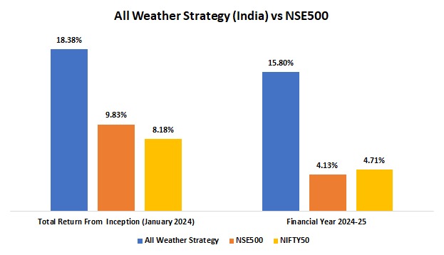 In January 2024, QuantMomo added the All-Weather strategy to minimize the drawdowns and enable investors with a SWAN (Sleep Well At Night) approach. The strategy included 5 assets comprising Equities (NSE500 Index), Gold, Silver, and bonds (5-year GILT and 10-year GILT). We are pleased to report that the strategy performed in line with its goals. The strategy has produced an alpha in the financial year thanks to Gold and Silver rallying to all-time highs.
