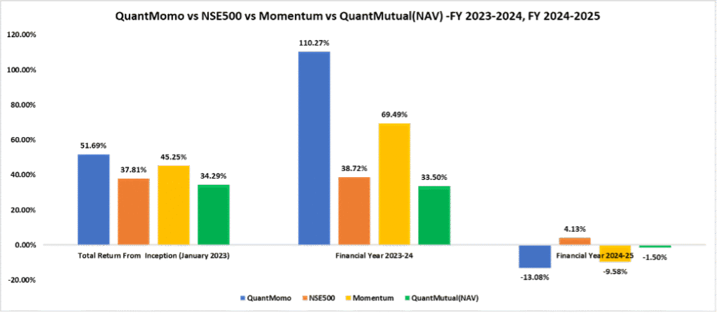 As most of our followers are aware, the FY 2024-25 year has now come to a close on March 31st 2025. In continuing our tradition of updating our followers, we will now review QuantMomo strategy performance for the Financial Year and also provide some data about comparisons with competitor ETF (Exchange Traded Funds) and Mutual Fund products.